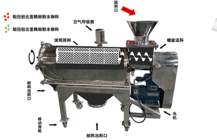 靈芝超微粉在 WQS30-100氣旋篩中如何進行篩分作用?靈芝粉置于機體內,物料通過螺旋輸送系統后,和氣流混合、霧化進入網筒內;通過網筒內風輪葉片使物料同時受離心力和旋風推進力,從而近使物料噴射過網,由細料排出口排出,不能過網的物料沿網筒壁從粗料排出口排出。